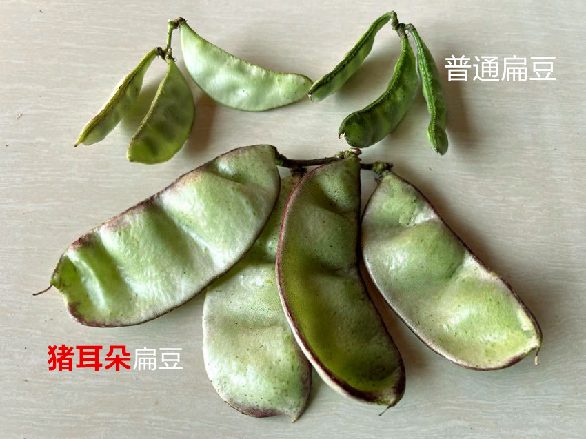 中熟,莢大,是一般扁豆莢的2倍以上,莢的邊緣帶紫紅,形似豬耳朵糖,甚是好看。