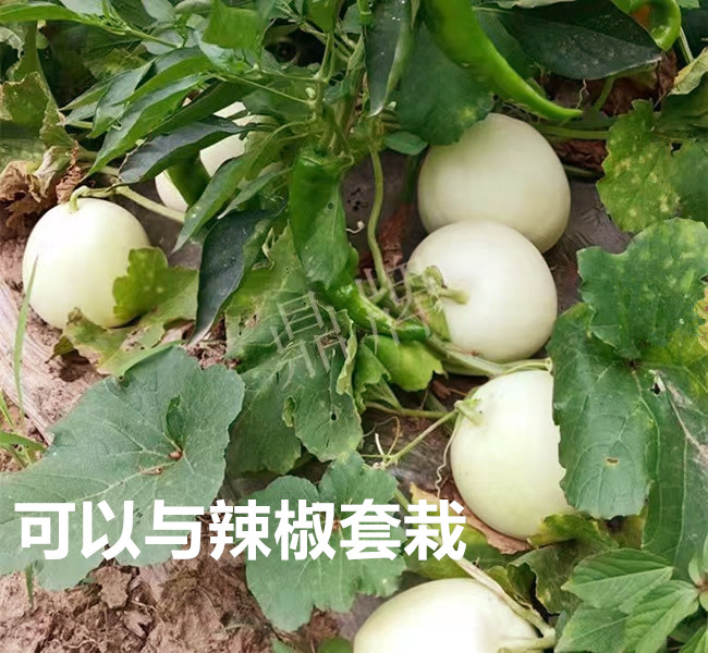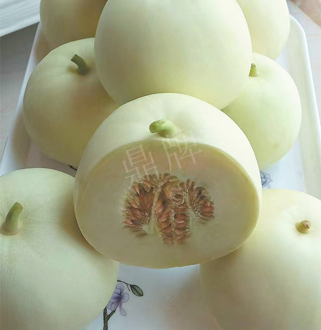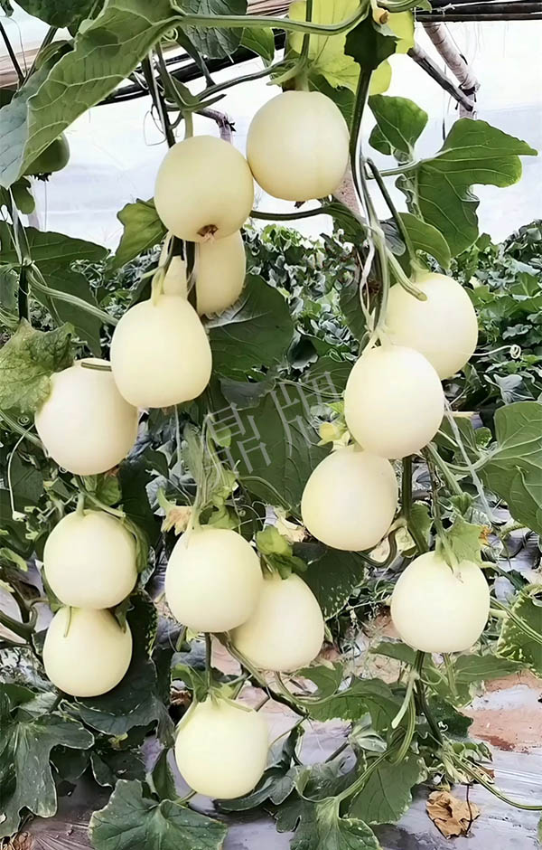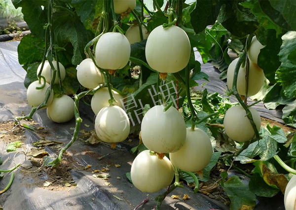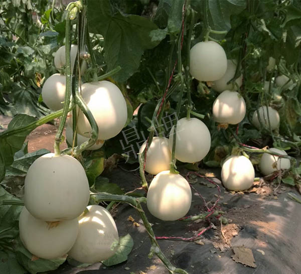 果實成熟后,果皮、果肉潤白,有一種天然質(zhì)感,看到就讓人喜歡;果肉厚達(dá)3厘米,這是薄皮甜瓜中難以見到的品種;連皮吃時能聽到“咔嚓”之聲,脆爽無比;甜度高達(dá)19度;坐果早而多,單果重650克左右;多雨天氣不易裂瓜,棚室、露地都能獲得豐產(chǎn)。